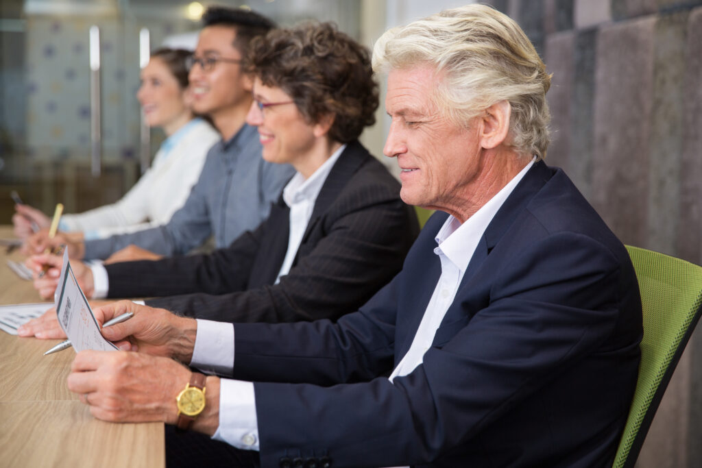 Handsome senior Caucasian businessman reading document at presentation. His colleagues listening to presentation or working behind him. They sitting in row. Conference concept